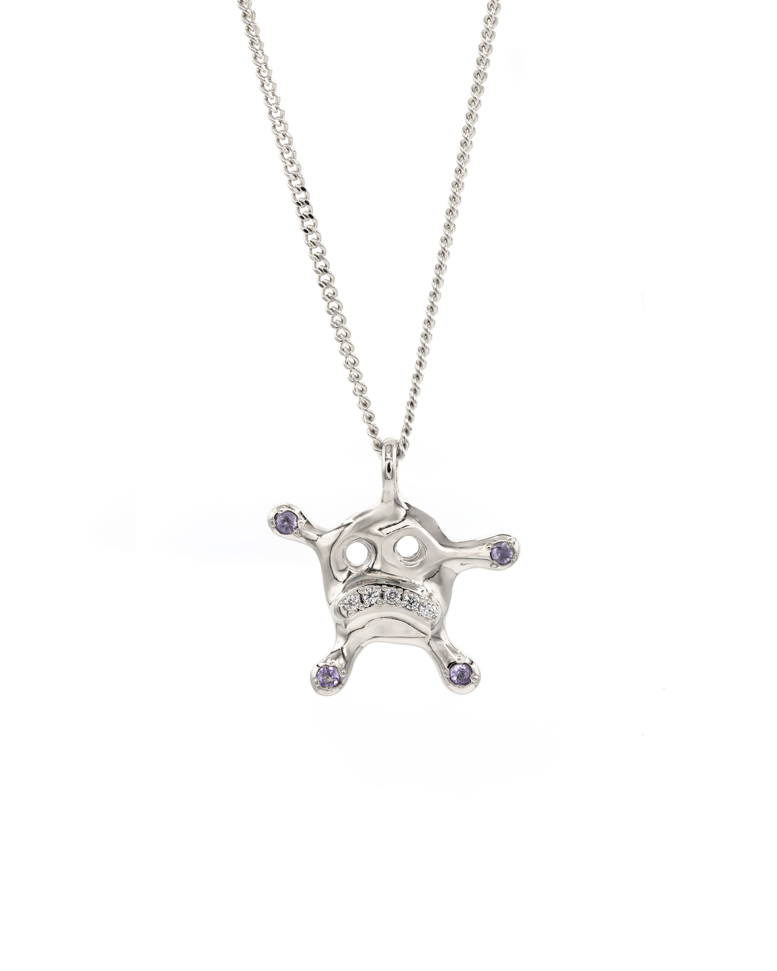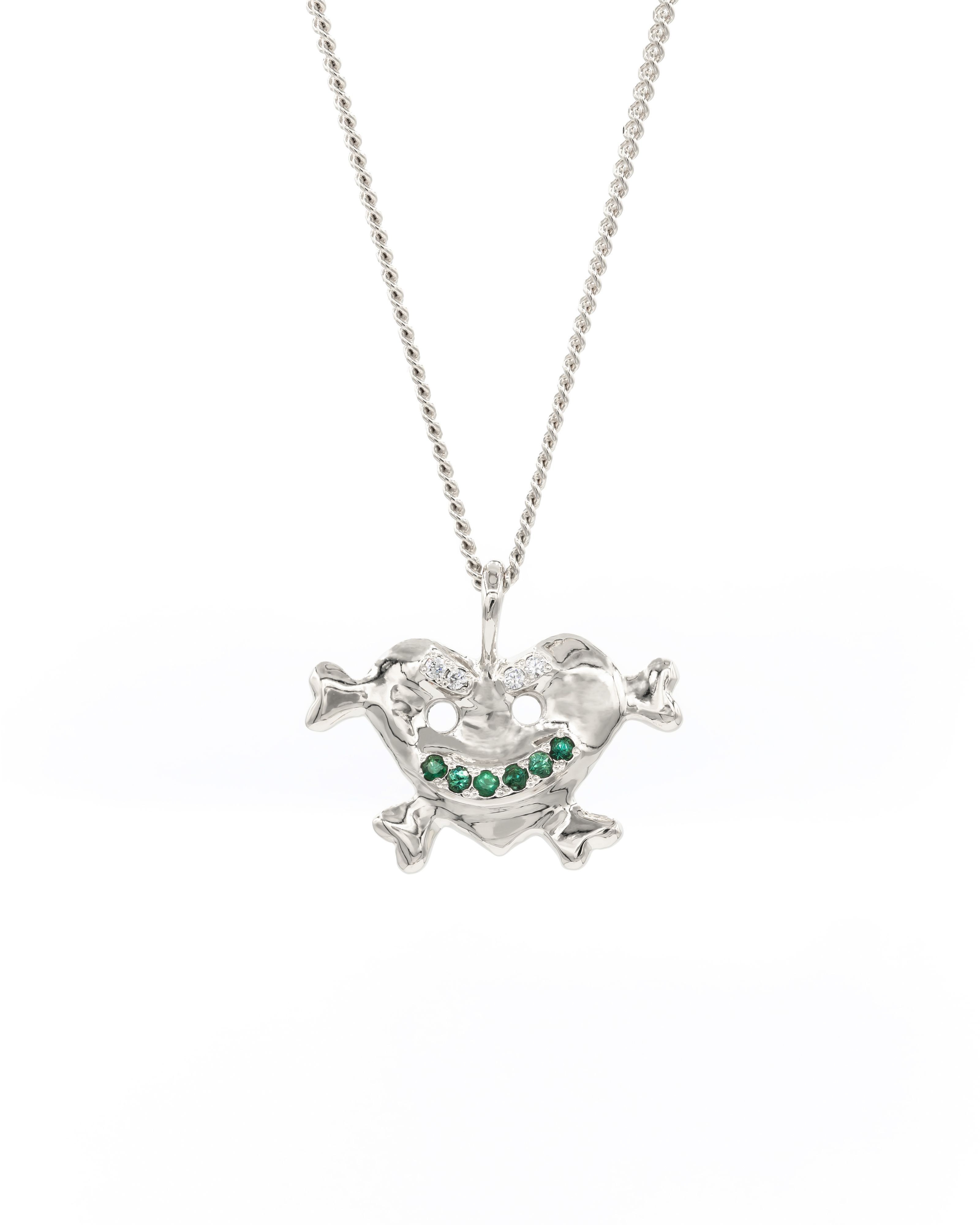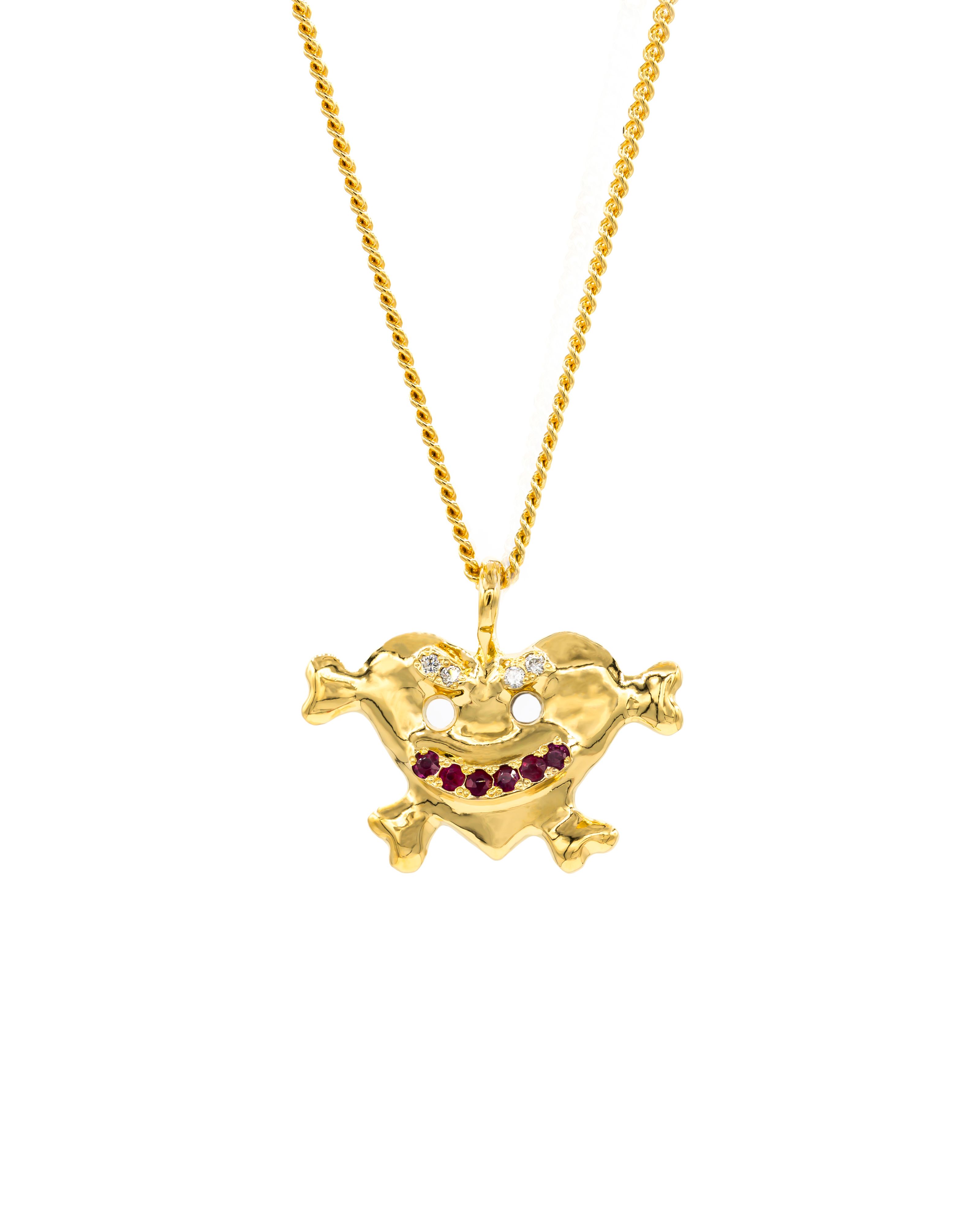 The Fragille x Gio capsule revisits several of Fragille’s most iconic designs through Gio’s personal lens. Rather than creating from scratch, the proces began with a simple question for Gio: “which Fragille pieces feel closest to you?”. From there, the two developed new interpretations, resulting in designs that feel both deeply familiar and entirely new. The designs include a heart-shaped smiley pendant, a puzzle shaped pendant and a sad smiley pendant, which is inspired by one of the very first and iconic Fragille designs. Each piece is crafted in sterling silver, finished either with rhodium plating or 18-karat gold plating and set with high-quality gemstones, including emeralds, rubies and sapphires. All of the pieces are finished with a subtle ‘Fragille x Gio’ engraving.
